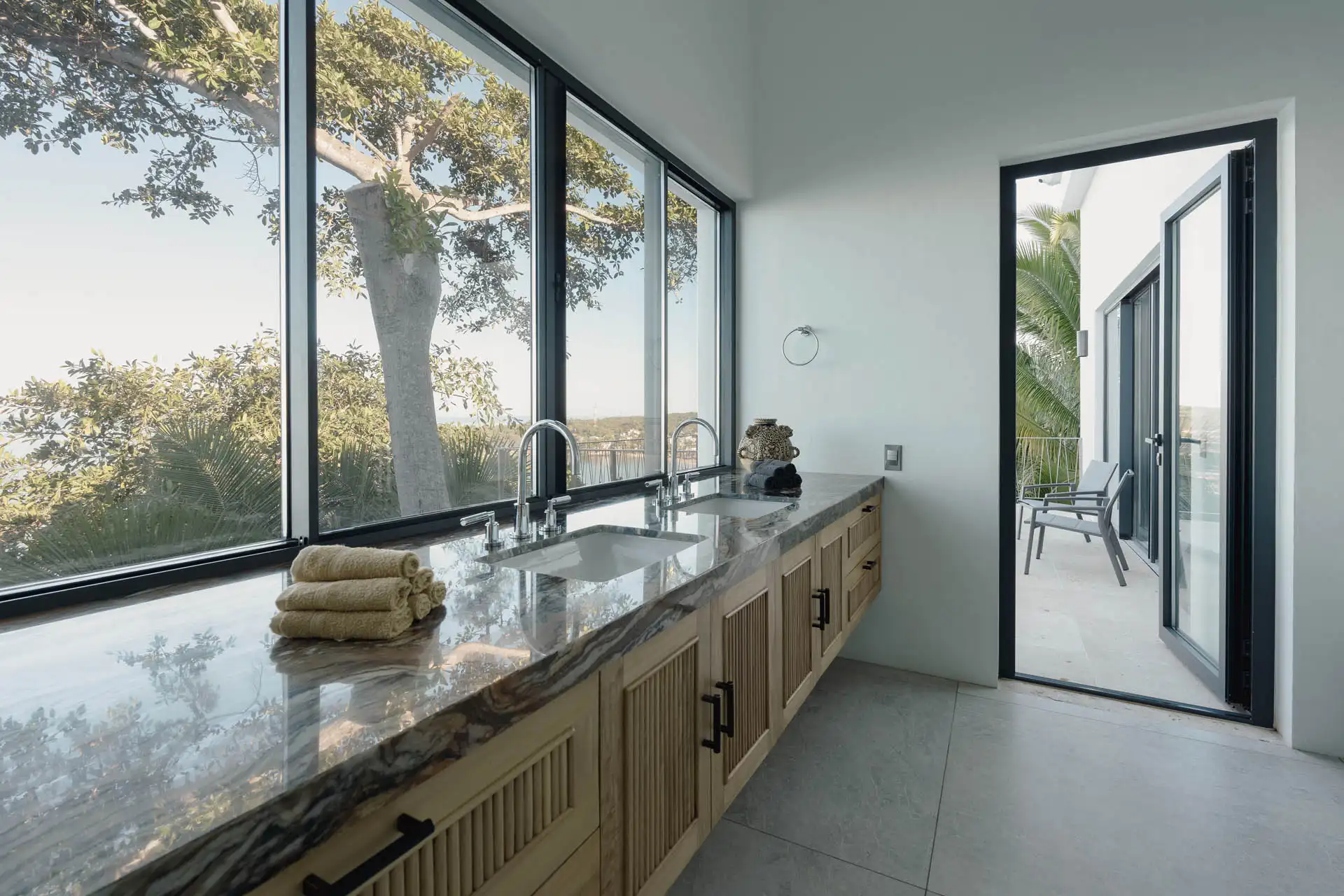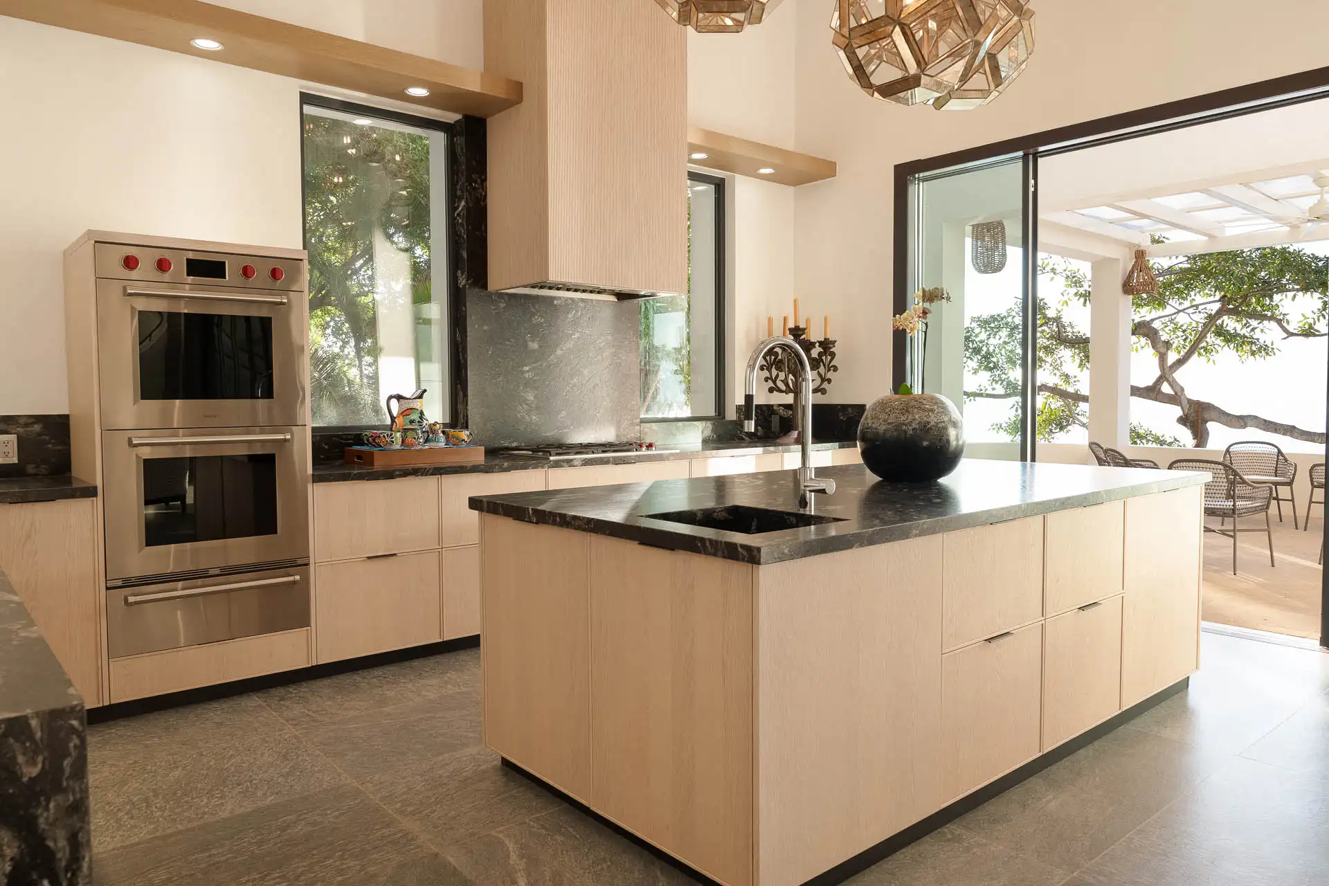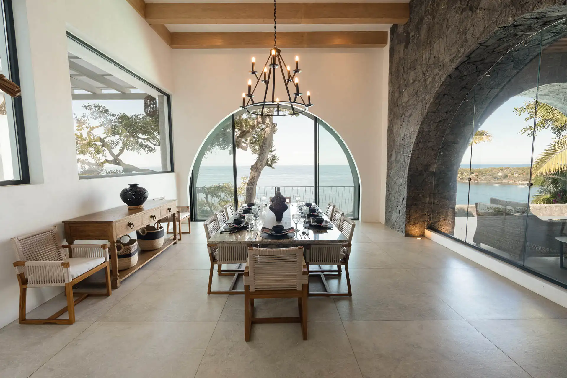 This casual yet contemporary residence boasts 11,000 square feet of interior space and an expansive 6,000 square feet of exceptional outdoor living creating a luxurious and relaxed lifestyle with ultimate privacy and solitude. Six beautiful ensuite bedrooms await, each offering full ocean views. Inside, discover winding staircases linking living spaces, a lounge, and a private office space. The home’s spacious family room flows into an open-concept kitchen, complete with designer cabinets, granite countertops, and top-of-the-line Wolf appliances, and includes dual 36″ Sub-Zero refrigerator and freezer units. The dining room provides breathtaking panoramic ocean views, perfect for intimate meals and large gatherings alike.